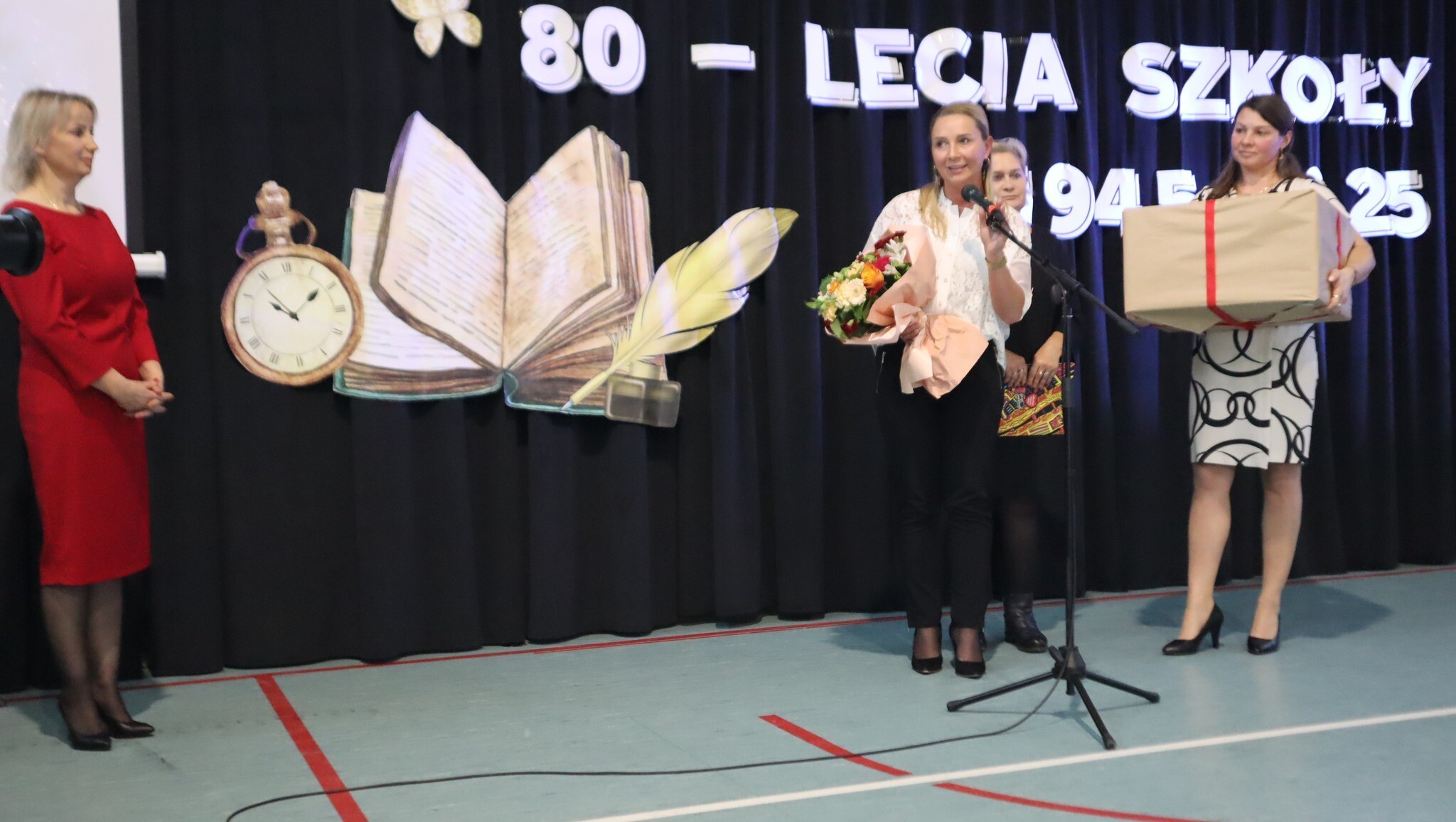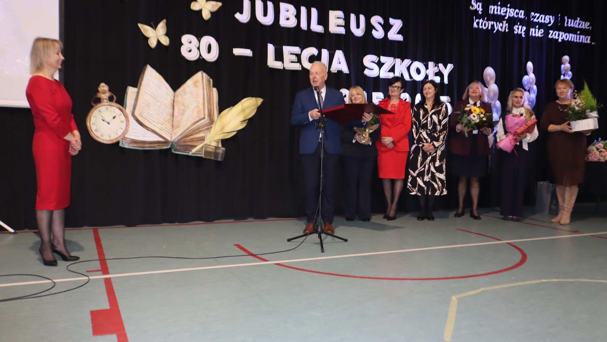 Po uroczystej Mszy pani dyrektor Agnieszka Fitowska powitała wszystkich gości z ogromnym ciepłem i serdecznością. W jej słowach wybrzmiała duma z historii szkoły, wdzięczność dla tych, którzy ją tworzyli i tworzą, oraz głęboki szacunek dla każdej osoby związanej z naszą małą, ale niezwykle silną społecznością.