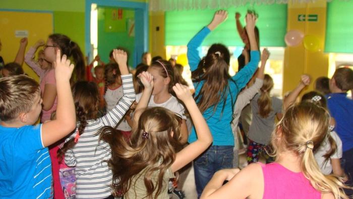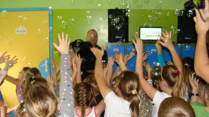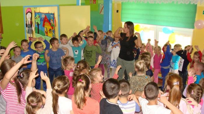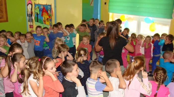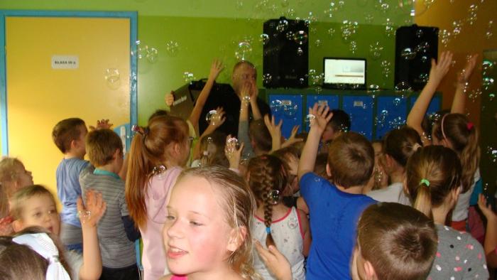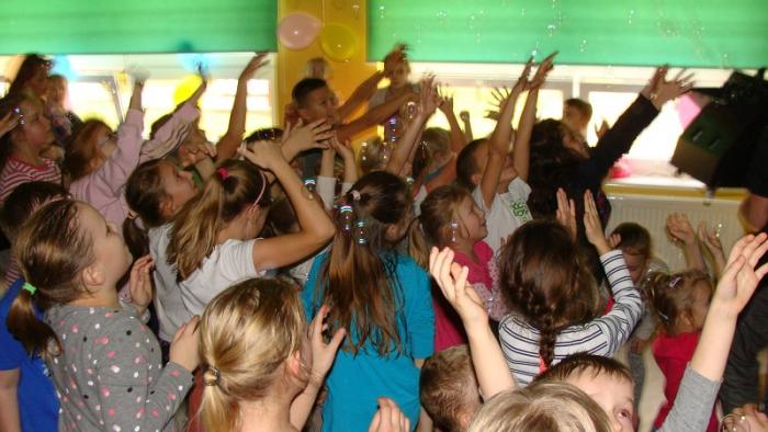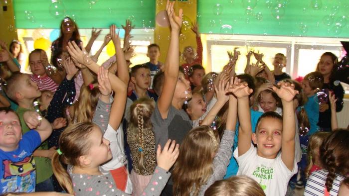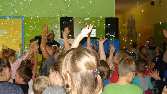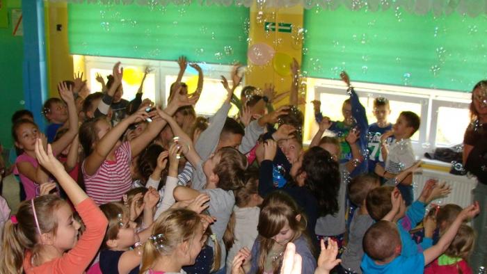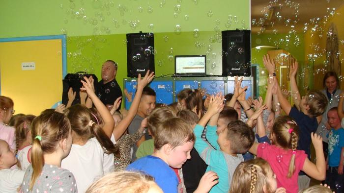 "Andrzejkowe pląsy". Zabawę poprowadziła p. Joanna Medalion. Było dużo tańca, śmiechu i ... bańki mydlane :)