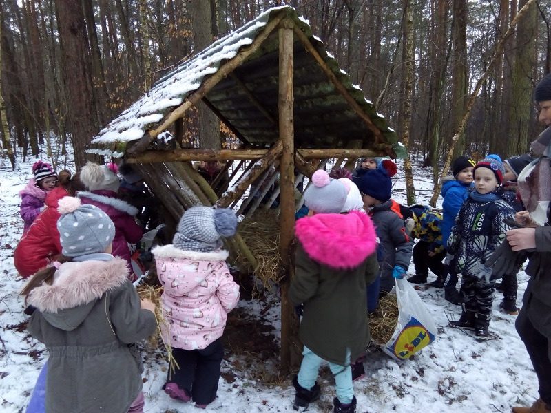 Dzieci wybrały się również do paśnika, aby tam zostawić sianko, warzywa i inne przysmaki dla sarenek, dzików i innych zwierzątek, które nie zapadły w zimowy sen.
