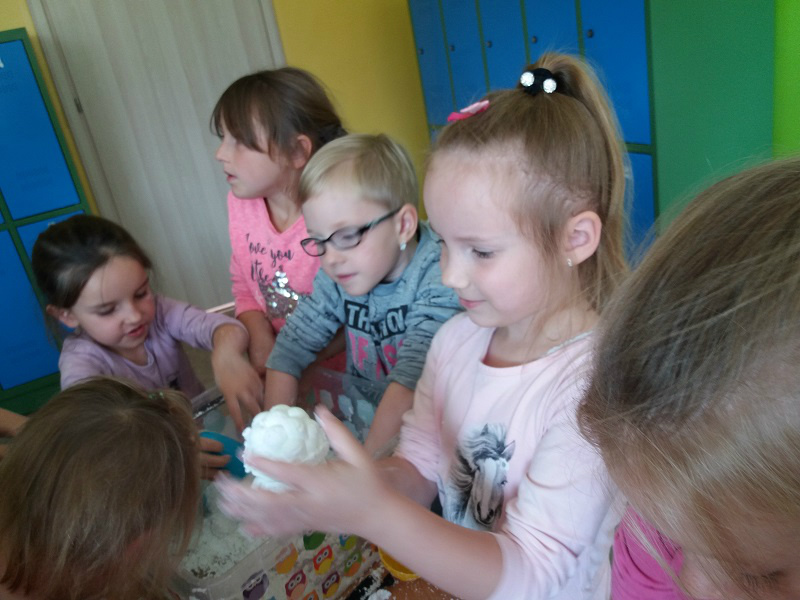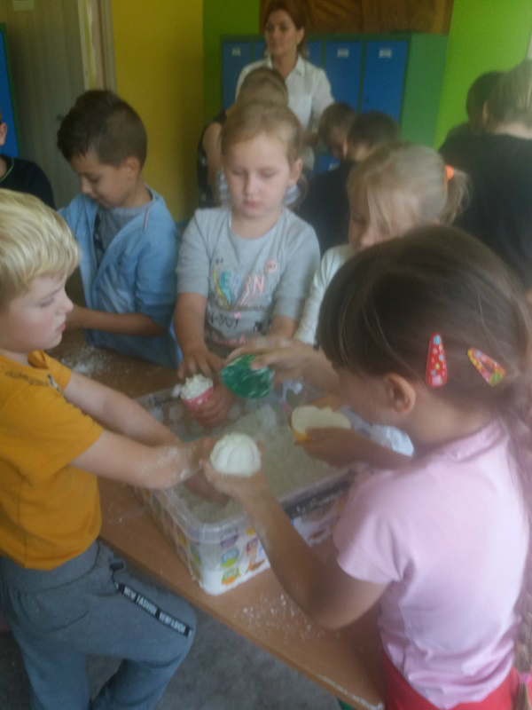 sensorycznych. Zabawa „piankoliną” to nie tylko moc wrażeń i atrakcji, ale również doskonałe ćwiczenie motoryki u dzieci. Piankolina posłużyła uczniom do stworzenia oryginalnych piaskowych rzeźb oraz niezłego bałaganu J Magiczny piasek był tak atrakcyjny, że do zabawy dołączyła nasza pani dyrektor i nauczyciele.