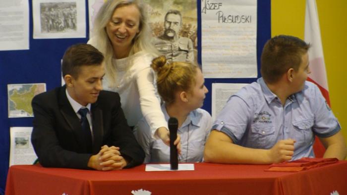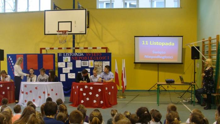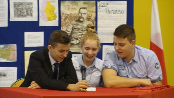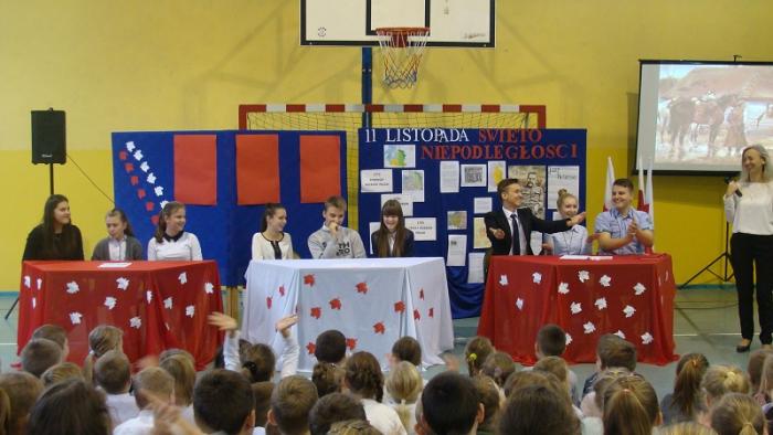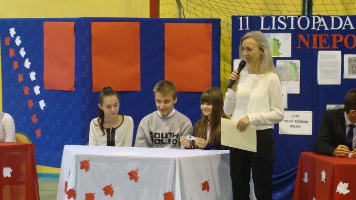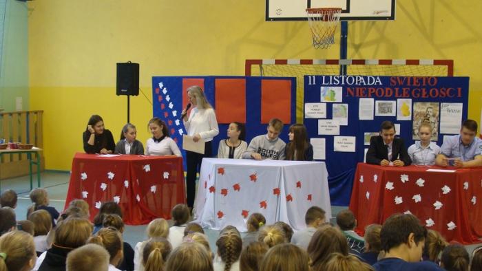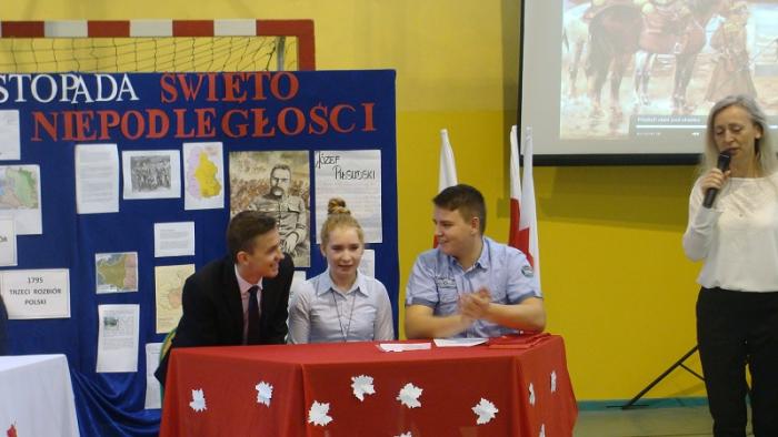 10 listopada 2015 r w naszej szkole odbył się uroczysty apel z okazji Narodowego Święta Niepodległości przygotowany przez p. E. Chmielewską i p. M. Adamowicz. Część pierwsza uroczystości przybliżyła uczniom historię narodu polskiego, natomiast część druga miała formę turnieju między klasami gimnazjalnymi.
