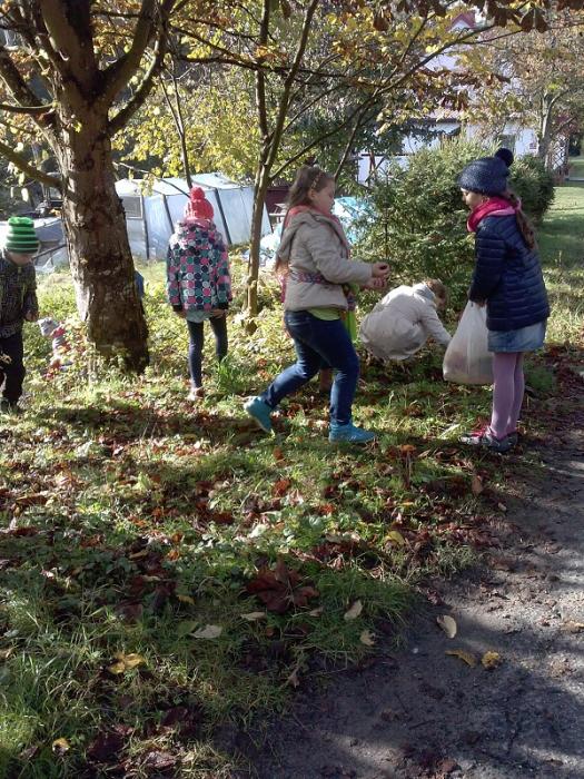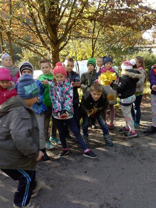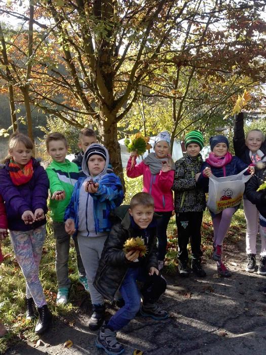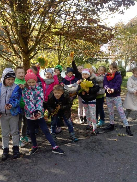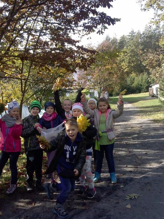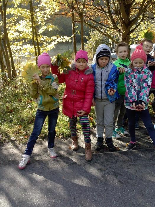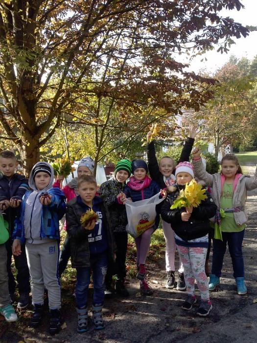 wybrali się na spacer w poszukiwaniu polskiej złotej jesieni. Uczniowie nazbierali kolorowe liście, żołędzie i kasztany, które później wykorzystali w klasie na zajęciach plastycznych tworząc jesienny wystrój w swojej sali lekcyjnej.