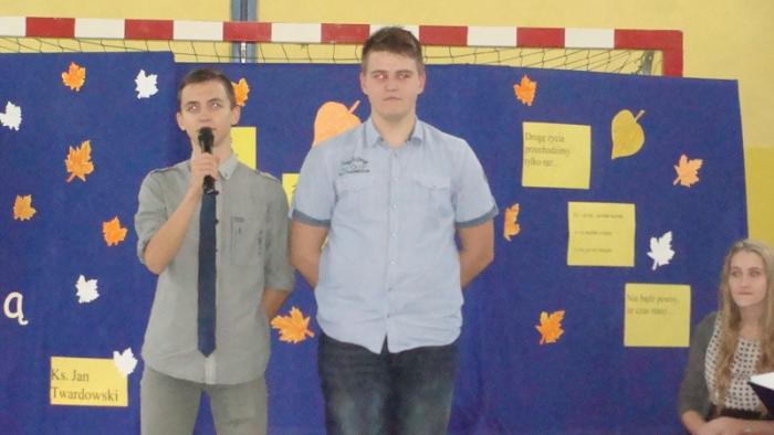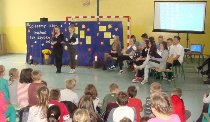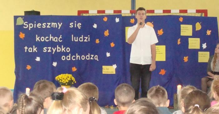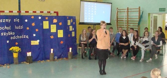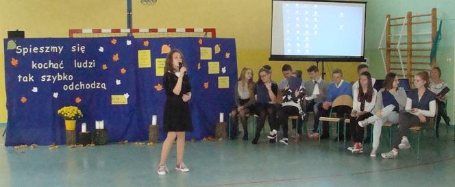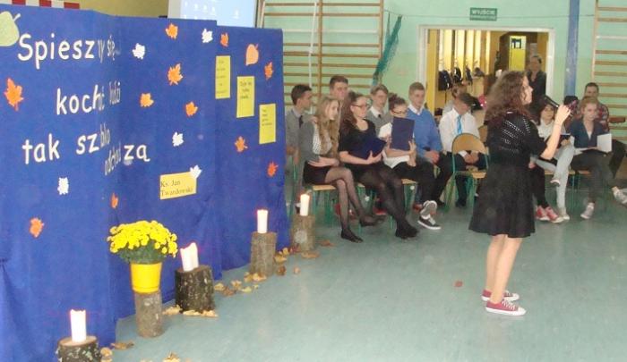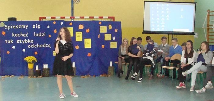 20 listopada 2015 r. w naszej szkole odył się montaż słowno-muzyczny "Żyje się tylko chwilę". To spotkanie dało nam sposobność, by w pośpiechu codzienności zastanowić się przez chwilę nad istotą życia i śmierci. Mottem przewodnim apelu były słowa ks. Jana Twardowskiego "Spieszmy się kochać ludzi, tak szybko odchodzą". Montaż przygotowali uczniowie klasy III gimnazjum oraz uczennica kl II g i V SP, pod opieką nauczycieli: Joanny Rybickiej, Anny Wiśniewskiej i Andrzeja Mościckiego.