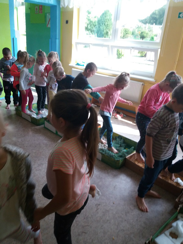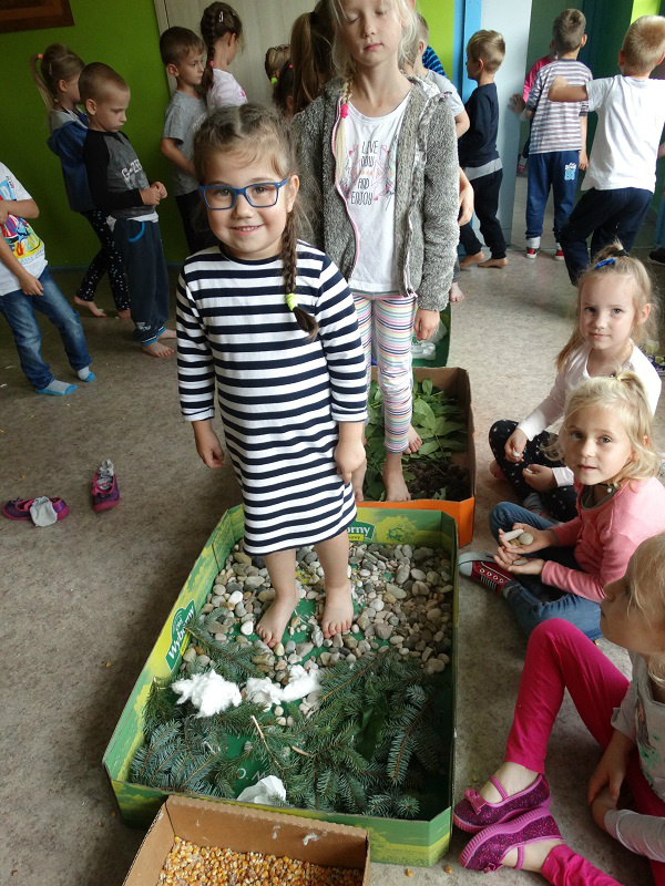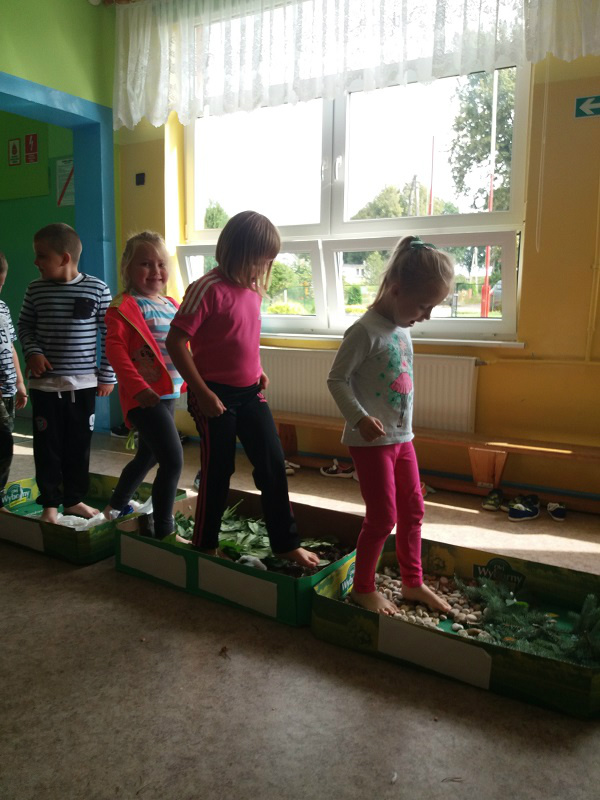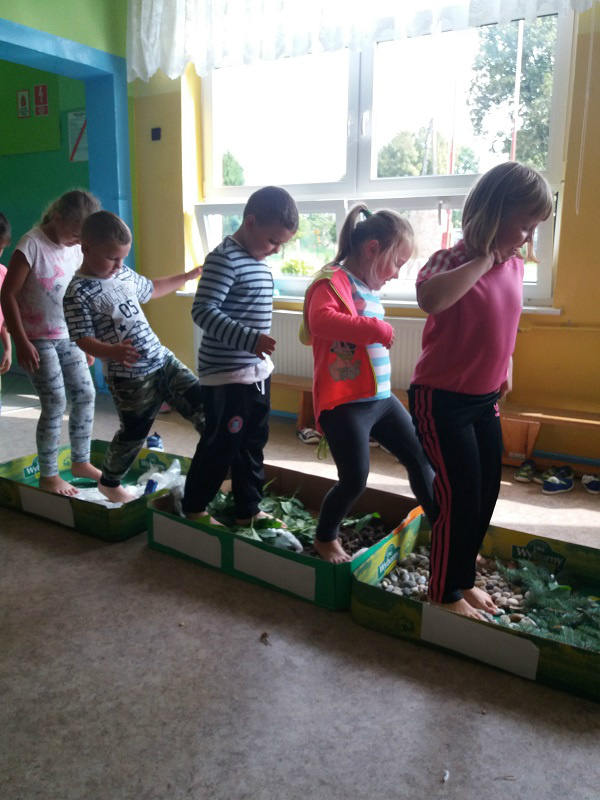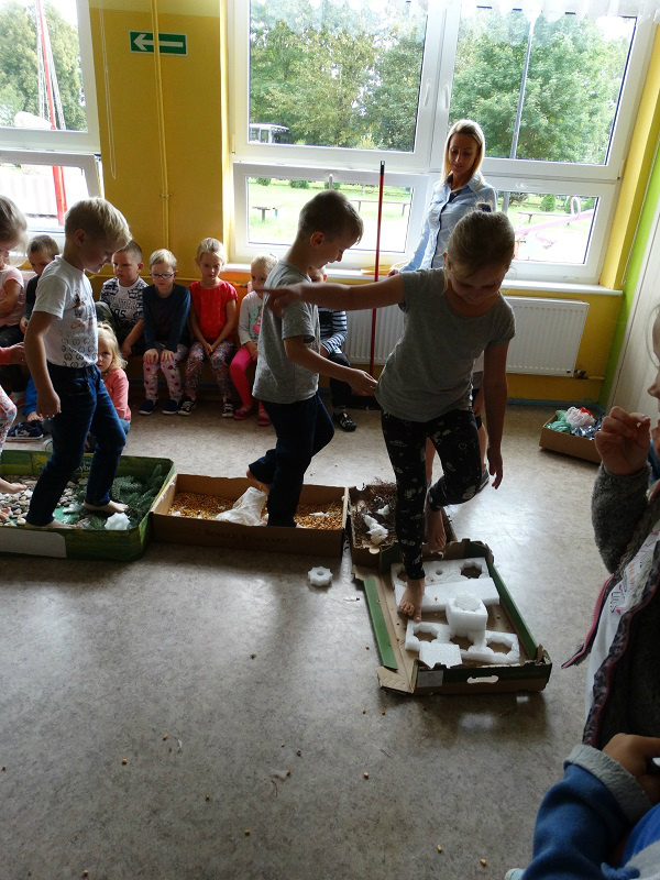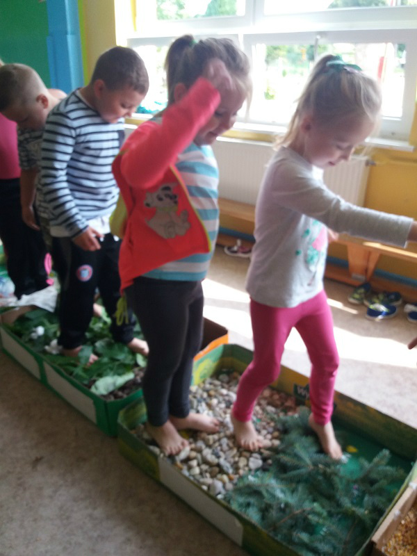 wyłożyliśmy liśćmi, szyszkami, korą, suchymi gałązkami, igliwiem, kukurydzą i kamieniami. Każdy dzielnie pokonywał ścieżkę . Wszyscy poradzili sobie na medal!!!