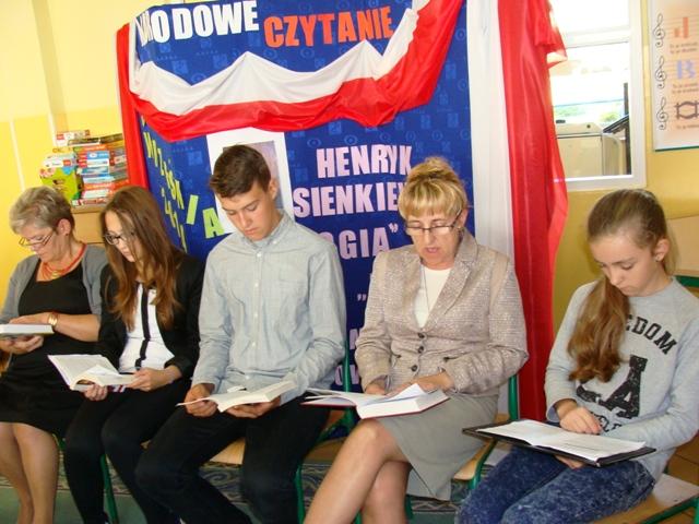 Nasza szkoła przyłączyła się do trzeciej edycji „Narodowego Czytania”, zainicjowanej przez Prezydenta Rzeczypospolitej Polskiej Bronisława Komorowskiego. Podstawowym celem przedsięwzięcia jest popularyzacja czytelnictwa, zwrócenie uwagi na bogactwo polskiej literatury, potrzebę dbałości o polszczyznę oraz wzmocnienie poczucia wspólnej tożsamości. W tym roku Prezydent zachęcał do wspólnej lektury „Trylogii” Henryka Sienkiewicza. W naszej szkole fragmenty „Pana Wołodyjowskiego” czytały Pani Dyrektor Mariola Łagoda -Ellwart, nauczyciele języka polskiego - Pani Gabriela Król oraz Pani Magdalena Adamowicz oraz uczniowie .Nad całością spotkania czuwał nauczyciel bibliotekarz – Wioletta Wilkosz.