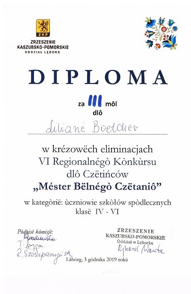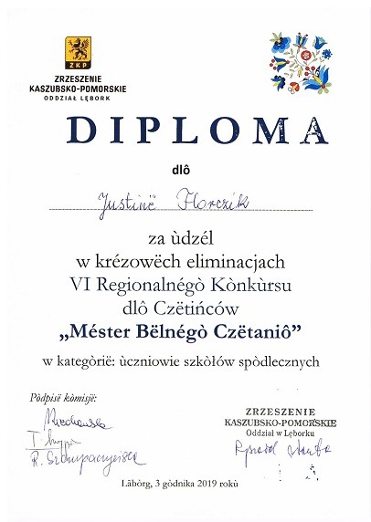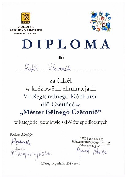W tym roku po raz pierwszy wzięliśmy udział w Konkursie „Méster Bëlnégò Czëtaniô” organizowany po raz VI przez Muzeum Piśmiennictwa i Muzyki Kaszubsko-Pomorskiej w Wejherowie. Konkurs, jak sama nazwa wskazuje, polega na pięknym czytaniu wybranych tekstów w języku kaszubskim. Ponieważ wybrane przez organizatora teksty dla poszczególnych kategorii były dość trudne, więc z naszej gminy tylko dwie szkoły zmierzyły się z tym wyzwaniem, Szkoła Podstawowa w Leśnicach i my.