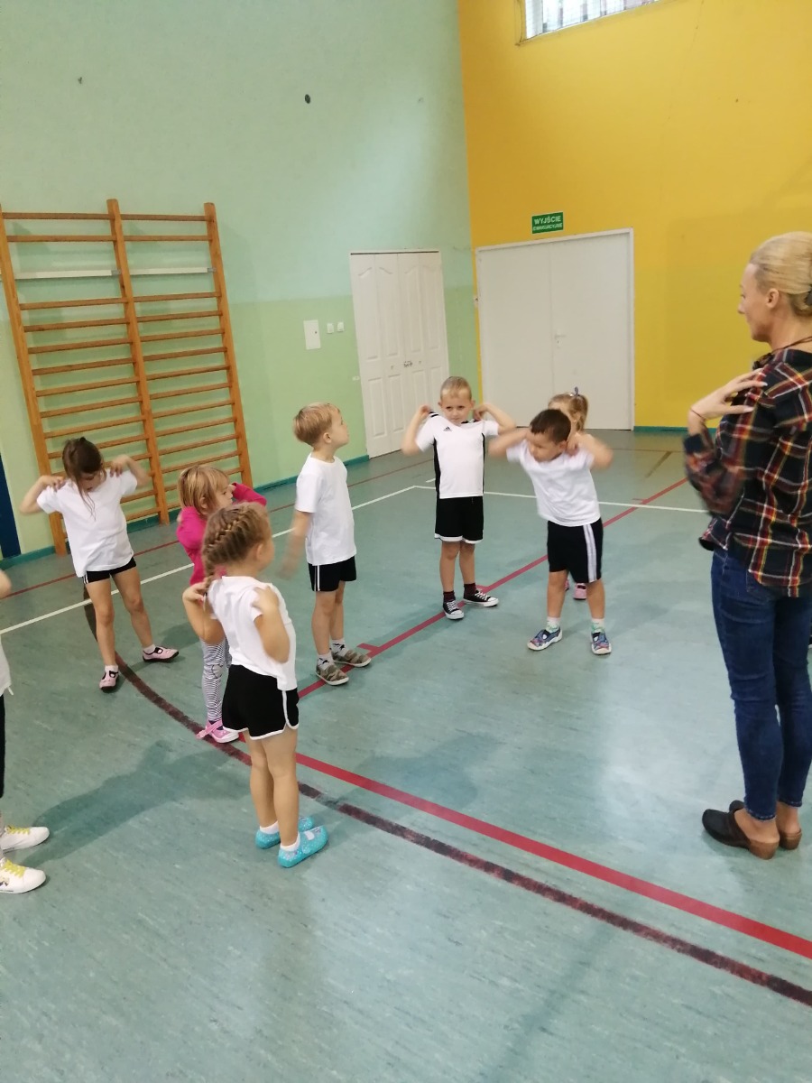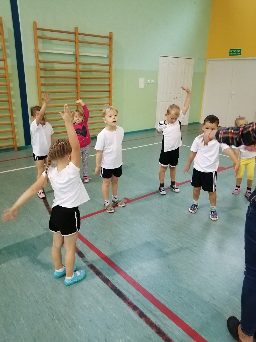 Na pierwszych zajęciach wychowania fizycznego na dużej sali gimnastycznej największą radość sprawiły dzieciom z oddziału przedszkolnego 5 -latków zabawy zespołowe, rywalizacje drużyn i pokazywanie wymyślonych przez siebie ćwiczeń.