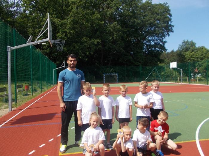 uczniowie klasy I szkoły podstawowej. Podczas podsumowania programu dzieci otrzymały legitymacje "Małego mistrza" oraz znaczki zdobytych sprawności sportowych. Program realizowali. Maria Renka i Arkdiusz Żółtowski.