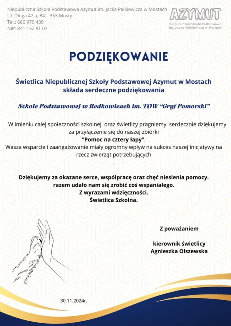 - Podziękowania dla szkoły za serce dla zwierząt.