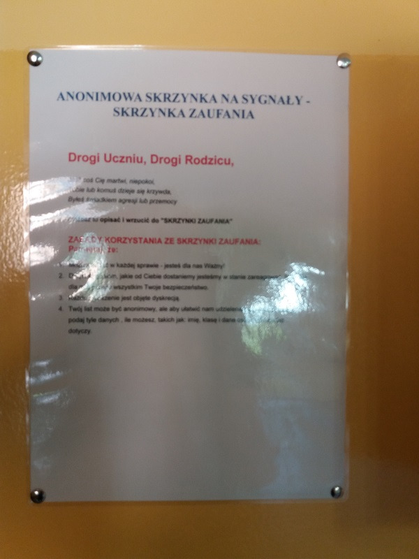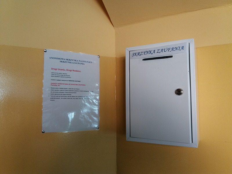 W holu głownym szkoły założyliśmy SKRZYNKĘ ZAUFANIA.