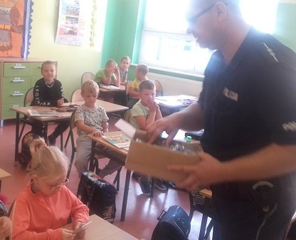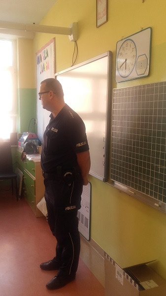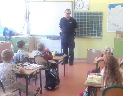 funkcjonariuszami policji.10 września 2018 r klasa I SP spotkała się z asp. Andrzejem Płatkiem z Komendy Powiatowej Policji w Lęborku, który przeprowadził z dziećmi zajęcia poświęcone bezpieczeństwu podczas drogi do i ze szkoły.