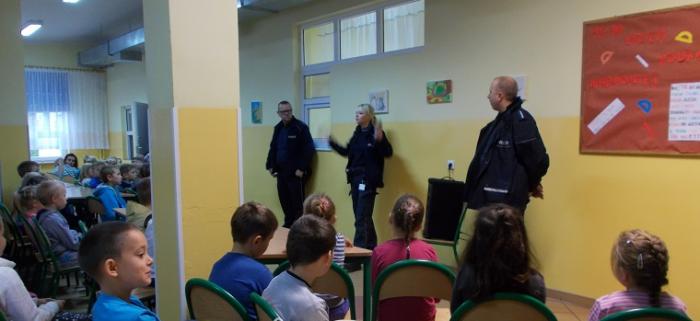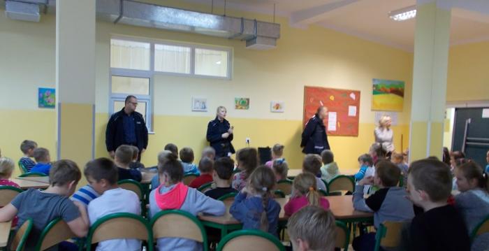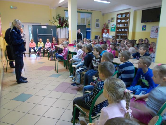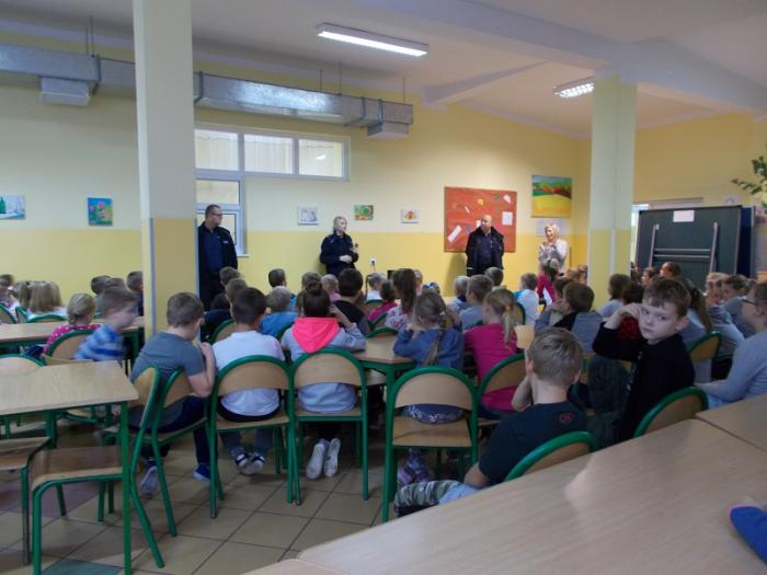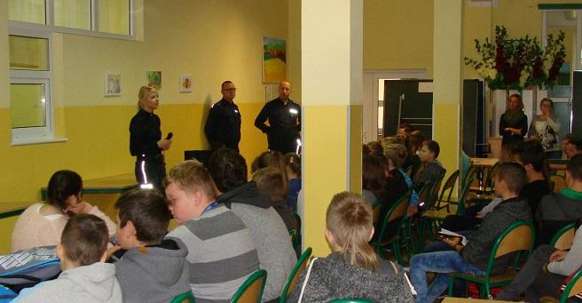 Uczniom klasy IV-VI szkoły podstawowej oraz I- III gimnazjum zostały przypomniane przez panią sierżant zasady kodeksu ruchu drogowego obowiązujące na drogach publicznych wszystkich jej uczesników, a zwłaszcza kierujących rowerami, motorami, skuterami i qładami. Policjantka poinformowała uczniów o konsekwencjach jakie grożą za nieprzestrzeganie podstawowych przepisów kodeksu ruchu drogowego, zarówno dla nich jako uczestników (niepełnoletnich) jak i ich rodziców.