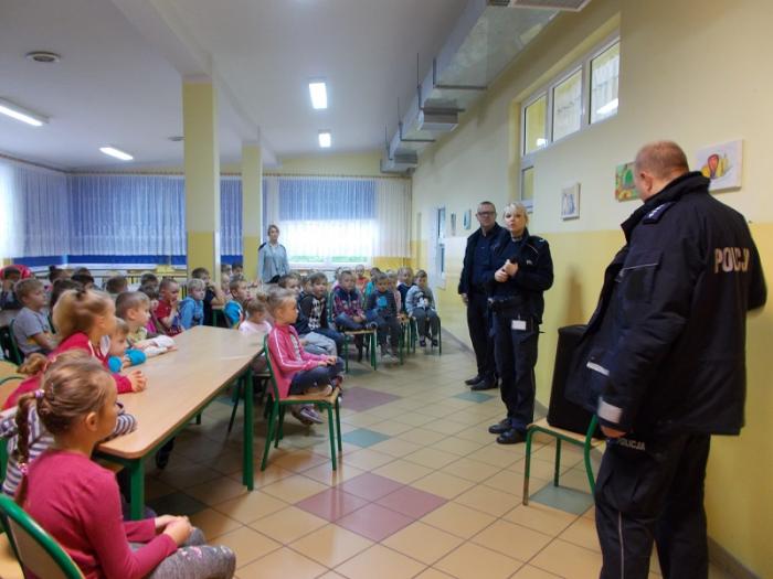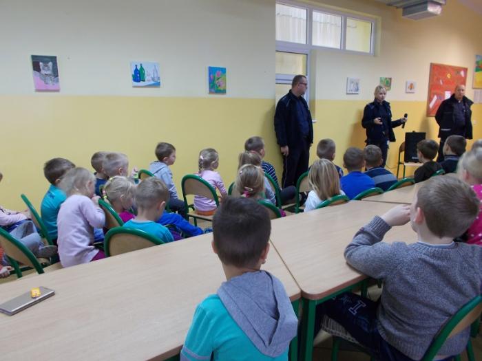 Wśród najmłodszej grupy uczniów oddziału przedszkolnego "5-latków" i klas I - III policjantka omówiła podstawowe zasady obowiązujące podczas poruszania się po drogach. Dotyczyły one w szczególności zwrócenia uwagi na widoczność pieszych poruszających się po drogach,chodnikach,ulicach, po zapadnięciu zmroku i ograniczonej widoczności.