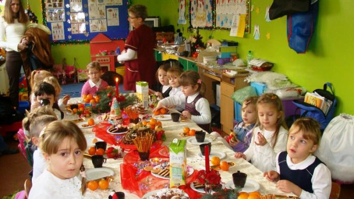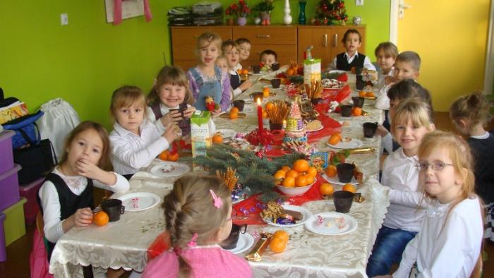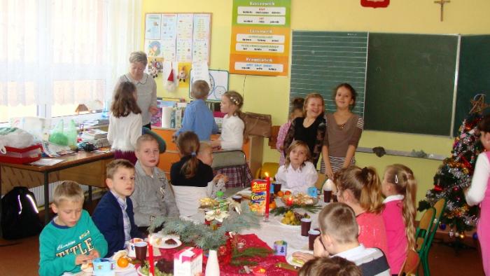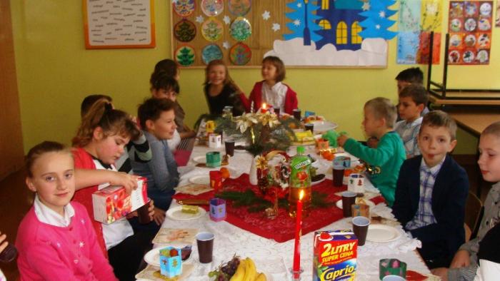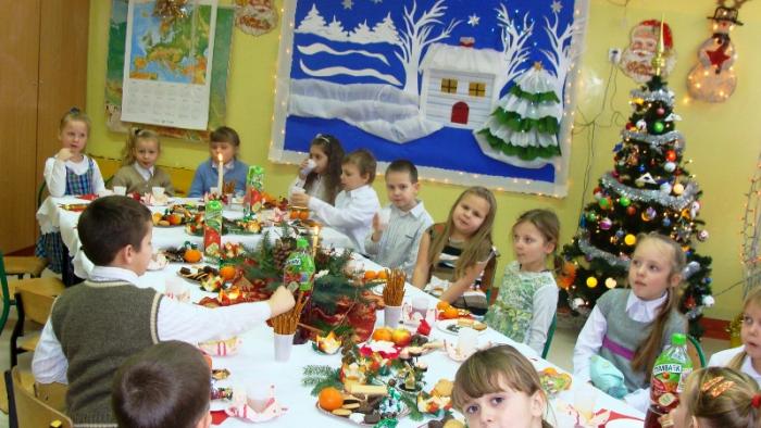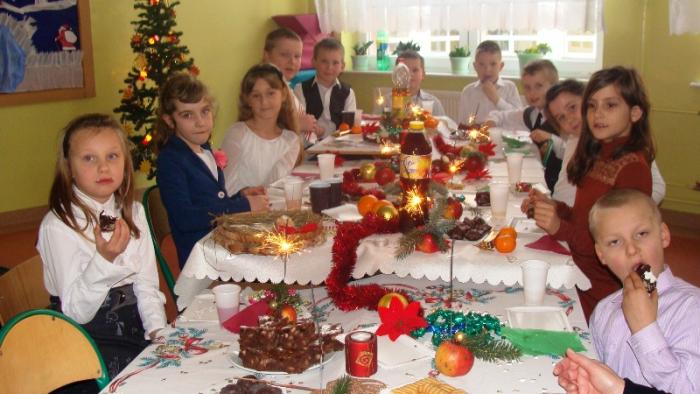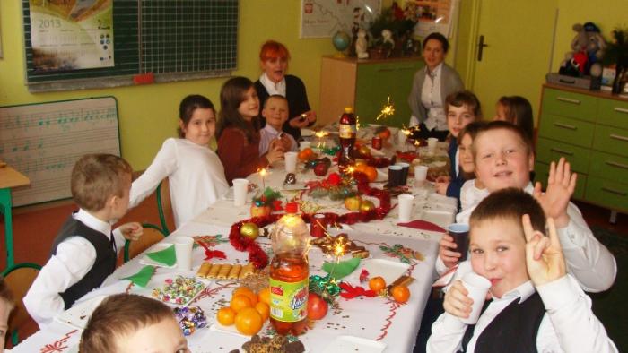 Po Jasełkach nastąpiło rozstrzygnięcie Szkolnego Konkursu na Świąteczne Ozdoby oraz Szkolnego Konkursu na Życzenia w Języku Niemieckim. Gratulujemy zwycięzcom. Na zakończenie pani Dyrektor złożyła wszystkim życzenia świąteczne i wspólnie zaśpiewaliśmy kolędę. Uczniowie w swoich klasach usiedli do wigilii.