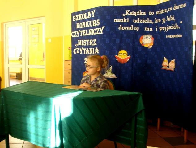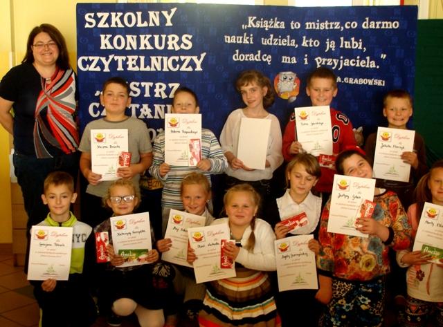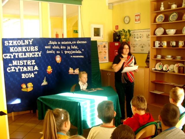29 października 2014 r. odbył się Szkolny Konkurs Czytelniczy "Mistrz czytania 2014" zorganizowany z okazji Międzynarodowego Miesiąca Bibliotek Szkolnych przez p. bibliotekarkę Wiolettę Wilkosz. W konkursie brali udział uczniowie klas II - IV szkoły podstawowej. Zadaniem uczestników konkursu było barwne przeczytanie fragmentu wybranej przez siebie bajki. Wszystkie dzieci czytały przepięknie. Jury (Maria Renka, Andrzej Mościcki, Wioletta Wilkosz) z przyjemnością wysłuchała czytających uczniów. Laureatami konkursu zostali: