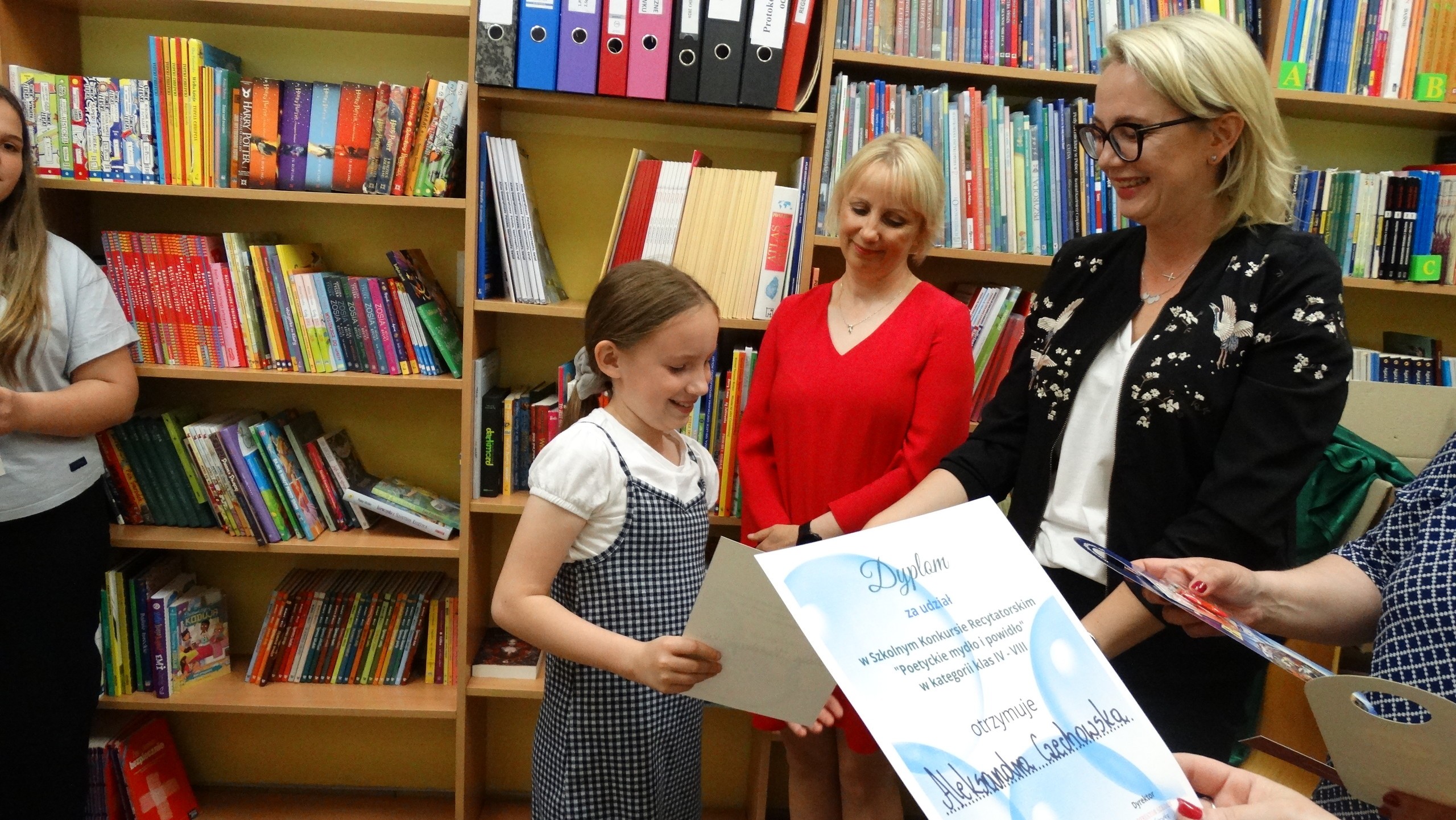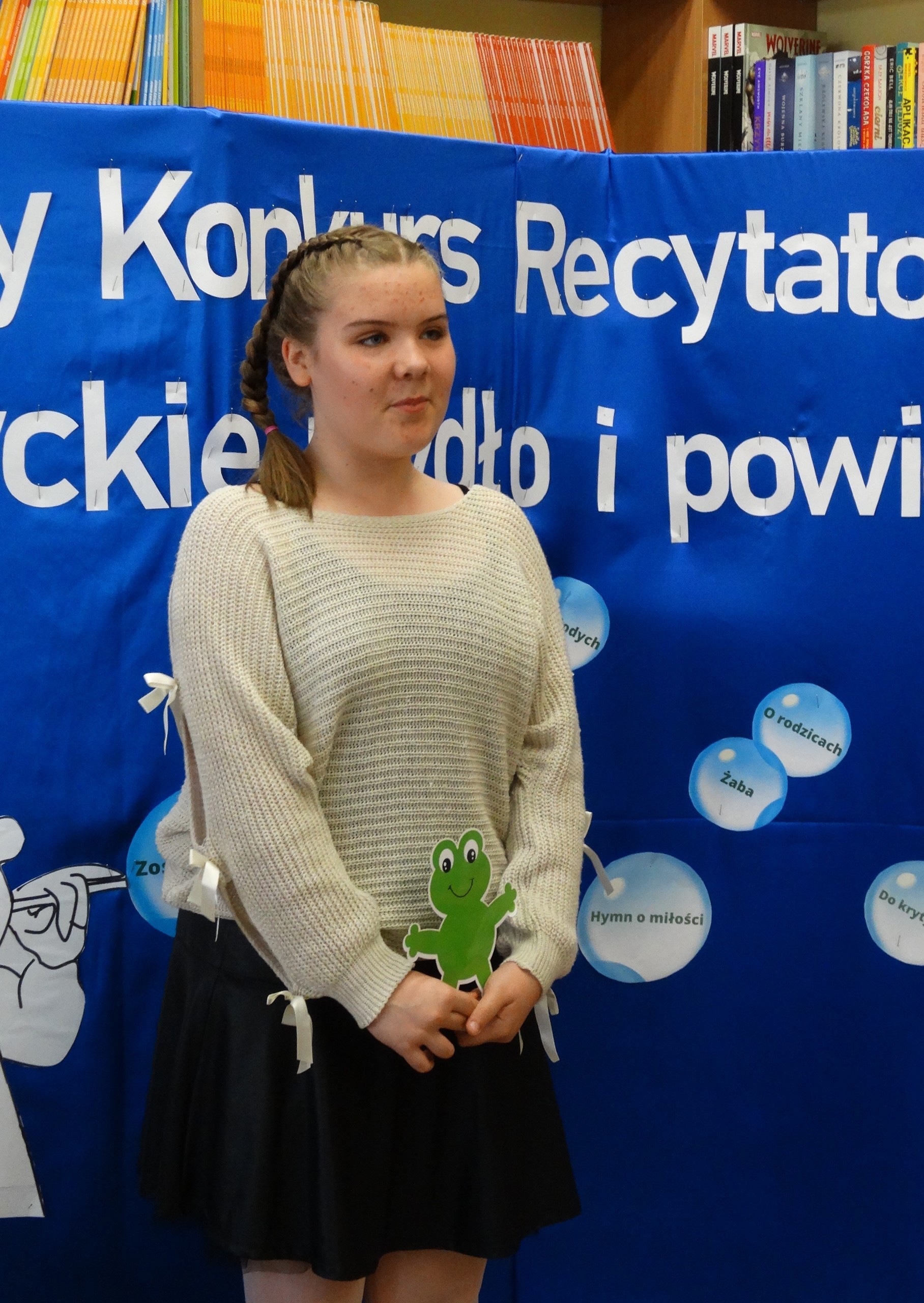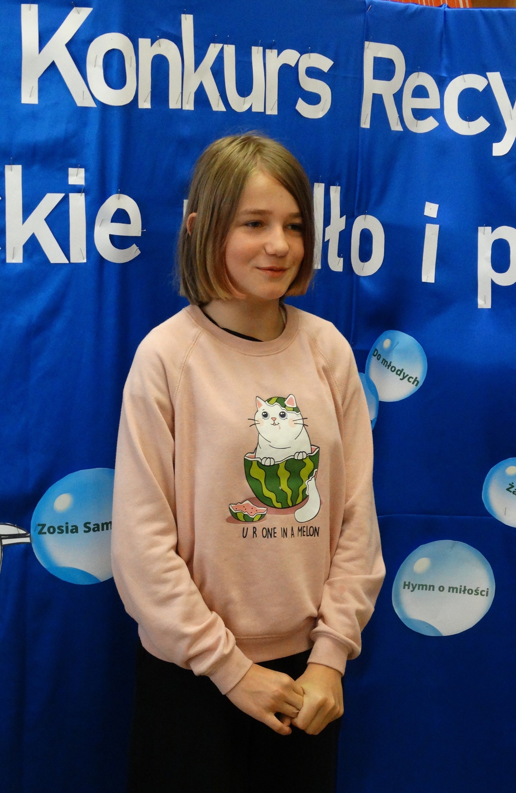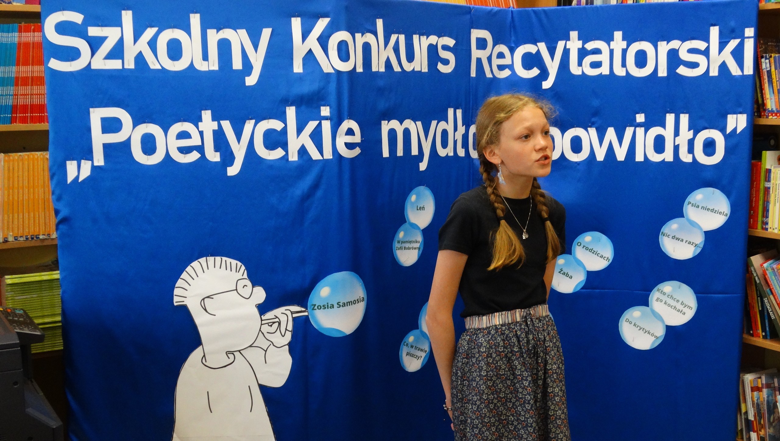 20 maja w naszej szkole odbył się szkolny konkurs recytatorski pt. : "Poetyckie mydło i powidło". W tym roku uczniowie mieli zupełną dowolność w wyborze utworów. Mogli zmierzyć się z każdym wierszem, jaki im się spodobał - stąd tytuł konkursu. Jury konkursu w składzie: pani dyrektor Agnieszka Fitowska, Wioletta Wilkosz i Zofia Laddach oceniało nie tylko interpretację, dykcję i ogólny wyraz artystyczny, ale także właściwy dobór tekstu. Wszyscy uczniowie biorący udział w konkursie poradzili sobie świetnie i spisali się na medal. Jesteśmy z nich bardzo dumne.