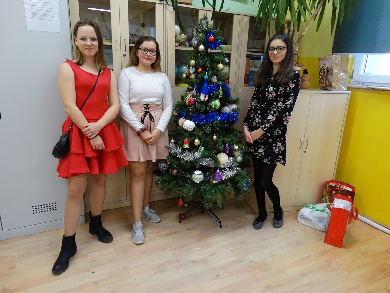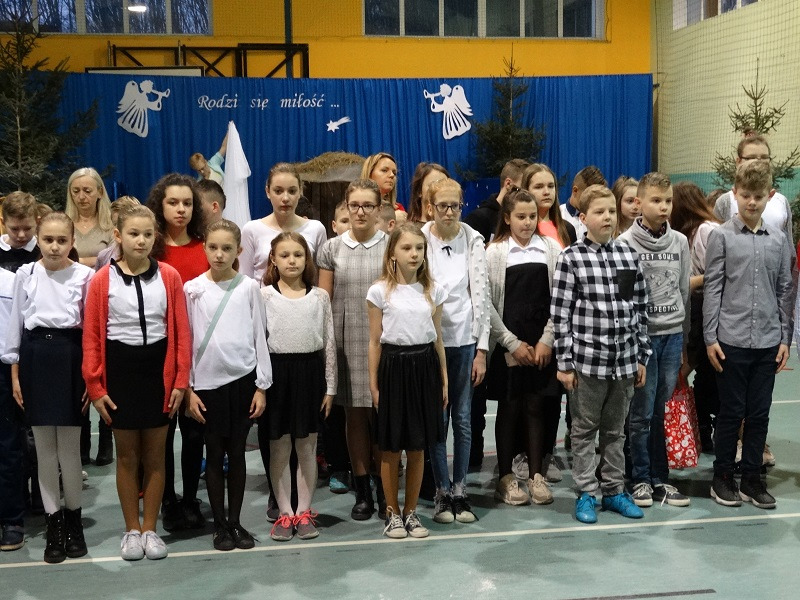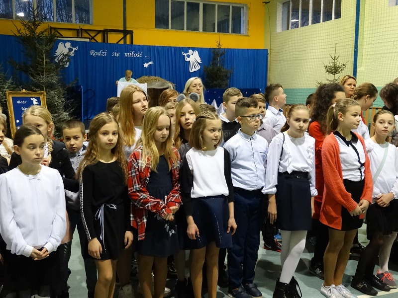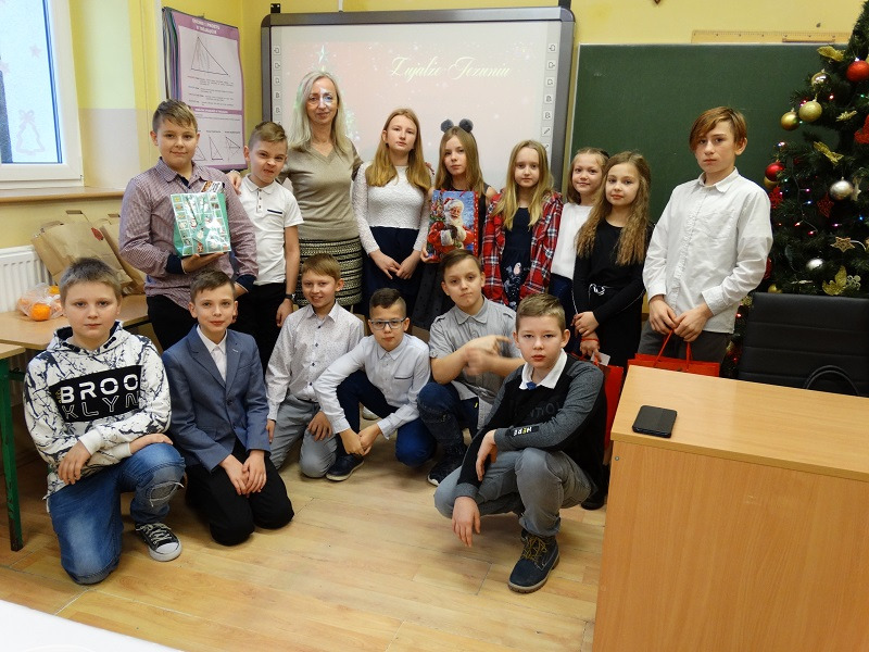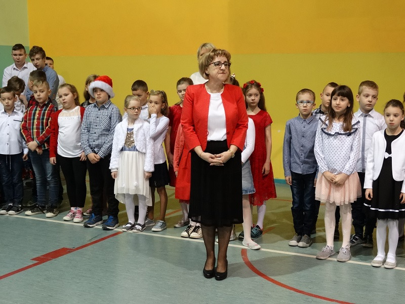 Pani Dyrektor Mariola Łagoda-Ellwart, która złożyła całej społeczności uczniowskiej życzenia spokojnych i radosnych Świąt Bożego Narodzenia. Po ogólnym spotkaniu na sali gimnastycznej, wszyscy spotkali się w swoich klasach, gdzie uczniowie podzielili się opłatkiem i złożyli sobie życzenia. W wielu klasach kolędowano i obdarowywano się drobnymi upominkami.