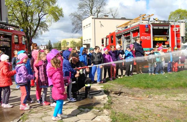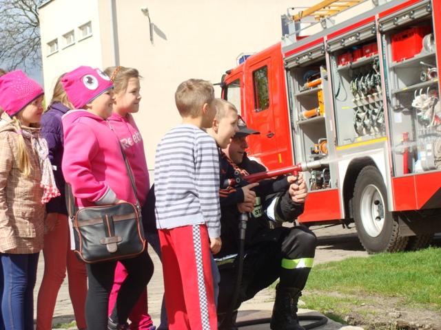 29 kwietnia 2015 r uczniowie klasy I a, I b i II wraz z opiekunami p. Iwoną Budzeń, p. Jolantą Karbowską i p. Joanną Karbowską wybrali się do Komendy Powiatowej Państwowej Straży Pożarnej w Lęborku.Na miejscu powitali nas Panowie Strażacy, którzy zaprezentowali całe wyposażenie wozu strażackiego, każdy mógł przymierzyć hełm strażacki oraz wejść do kabiny wozu. Dzięki tej wizycie dzieci dowiedziały się na czym polega praca strażaka, jakim sprzętem posługują się strażacy oraz jak zachować się w czasie pożaru.