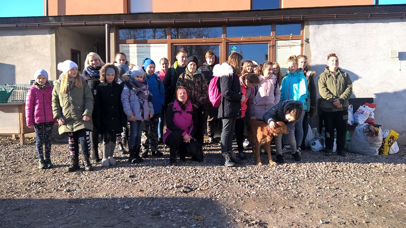 mokrą karmę dla zwierząt, miski, produkty spożywcze (kasze, ryż, makarony), zabawki a także rzeczy przydatne na zbliżającą się zimową porę (koce, kołdry). Dary zostały przekazane 16.11.2018 przez przedstawicieli klas od IV SP do III G którzy wraz z opiekunami p. Magdaleną Adamowicz i p. Adrianną Meyer odwiedzili schronisko dla zwierząt BAJER w Małoszycach. Z pracą schroniska i losem porzuconych zwierząt zapoznała nas Pani prowadząca schronisko Tatiana Twardziak.
