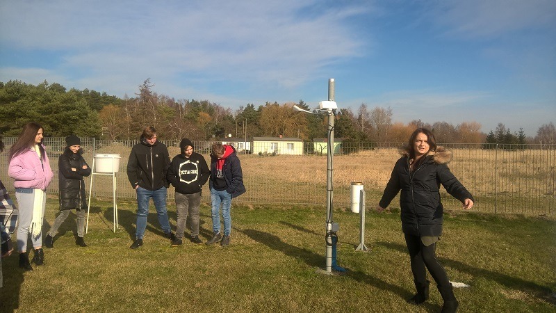 W ogródku meteorologicznym uczniowie zobaczyli przyrządy i urządzenia do pomiaru temperatury i wilgotności powietrza, ciśnienia, nasłonecznienia, ilości opadów, prędkości i kierunku wiatru. Prowadząca zajęcia bardzo szczegółowo omówiła budowę oraz zasady działania tych przyrządów m.in.: klatkę meteorologiczną, deszczomierz, poletko z termometrami gruntowymi, anemometr. Natomiast w biurze stacji uczniowie mogli zaobserwować jak powstaje depesza meteorologiczna.