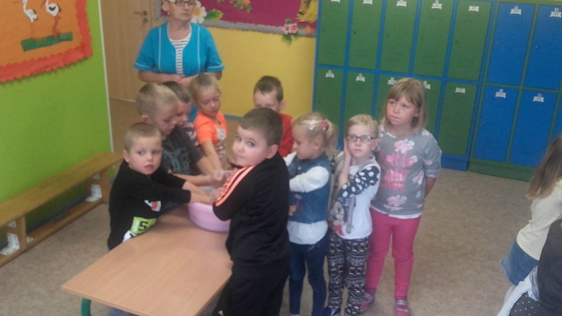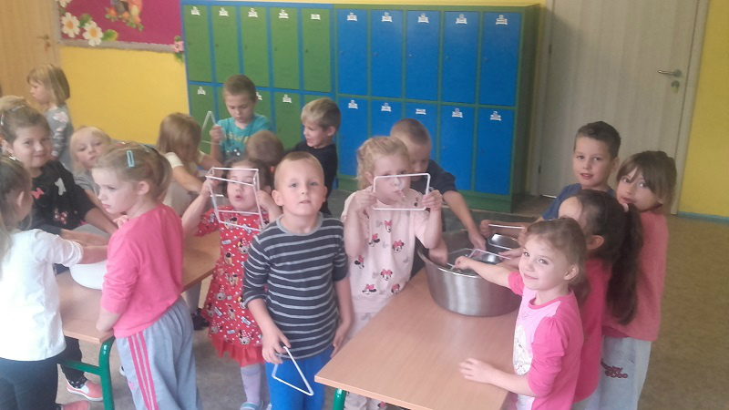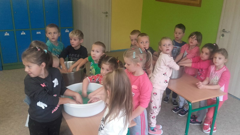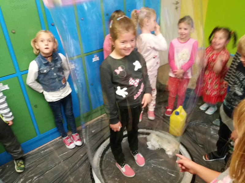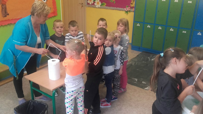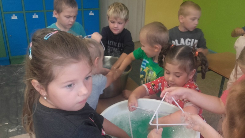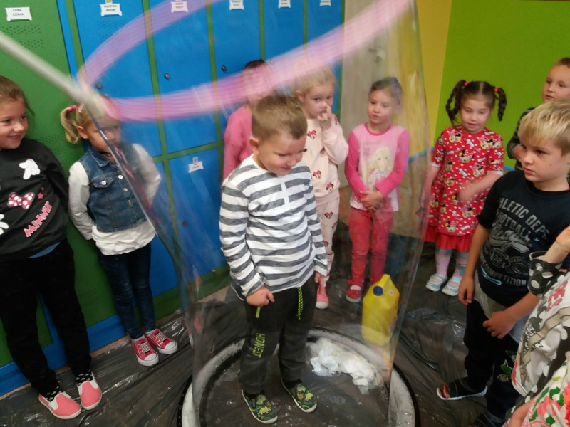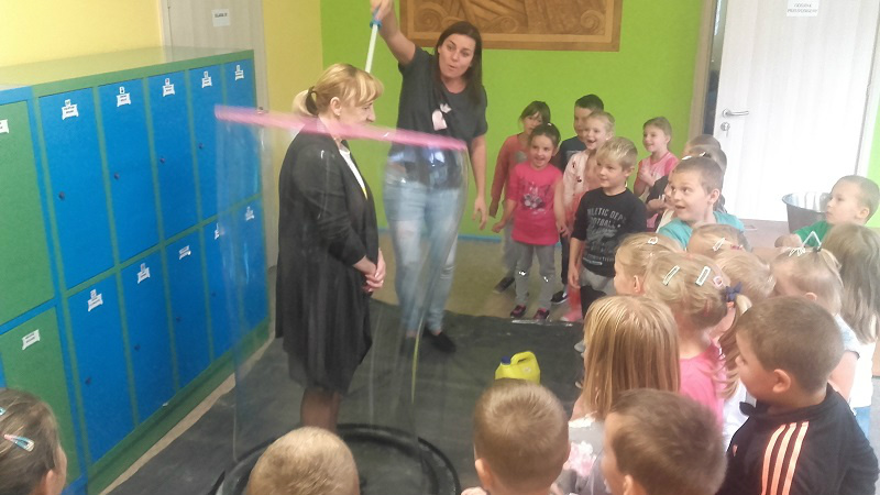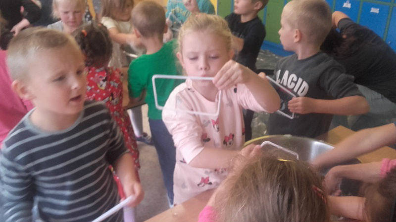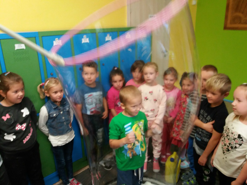 festiwal baniek mydlanych. Dzieci z wielkim zainteresowaniem obserwowały „bańkowe” eksperymenty, dzięki którym powstawały olbrzymie bańki mydlane o różnych kształtach, połyskujące kolorami tęczy. To był niesamowity widok, ponieważ baniek było tysiące, a każde dziecko chciało zatrzymać choć jedną dla siebie. W zabawie uczestniczyła pani dyrektor i nauczyciele, którzy wyjaśnili dzieciom jak zmniejszyć napięcie powierzchniowe wody za pomocą mydła i stworzyć przepiękne bańki mydlane.
