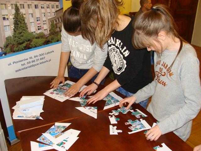 Następnie organizatorzy zaprosili młodzież na gry edukacyjne dotyczące tematyki Unii Europejskiej: memo (flagi państw członkowskich UE), puzzle (obrazujące państwa członkowskie UE i najważniejsze miejsca oraz symbole z danego kraju), „bystre oko” (mapa z elementami do przyczepiania), rebusy i krzyżówki o tematyce państw członkowskich UE (o różnym stopniu trudności). Na zakończenie pracownik Starostwa oprowadził uczestników po budynku. Dla naszych uczniów była to niezwykła okazja do poznania budynku Starostwa Powiatowego w Lęborku.