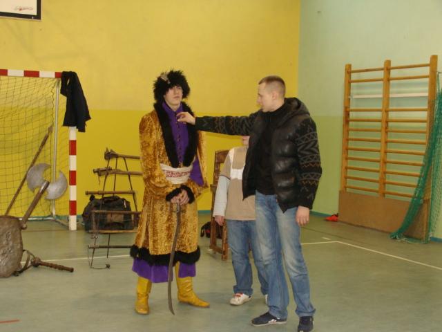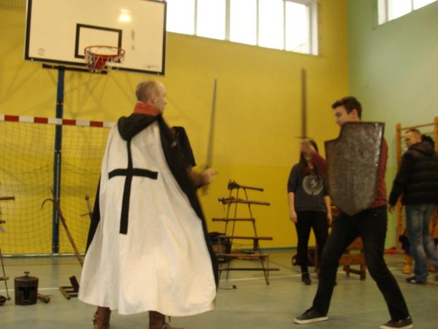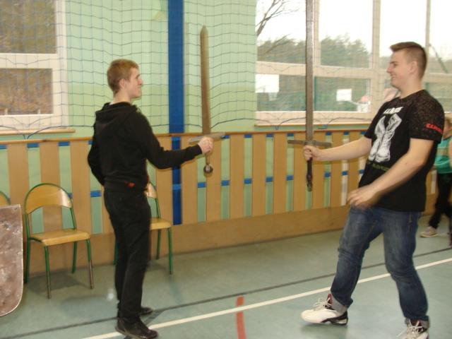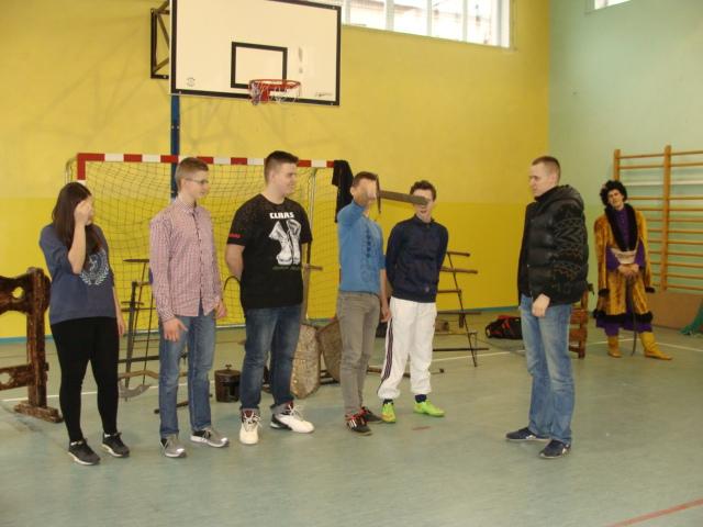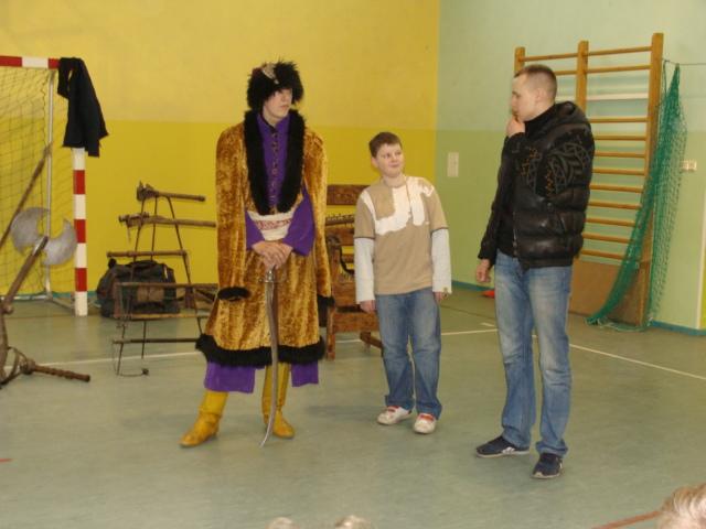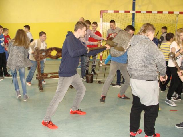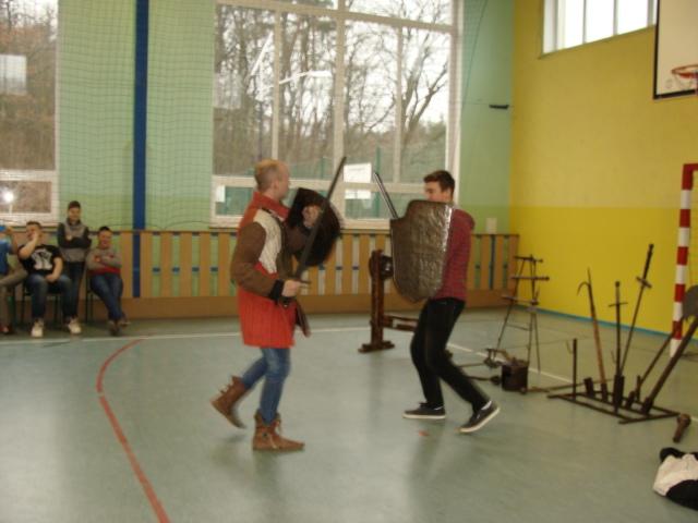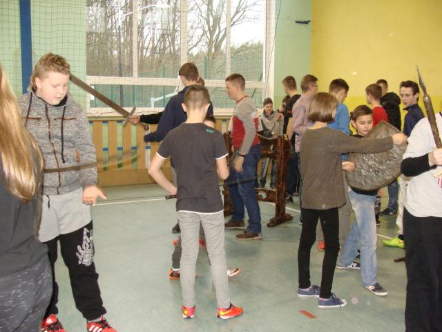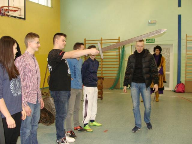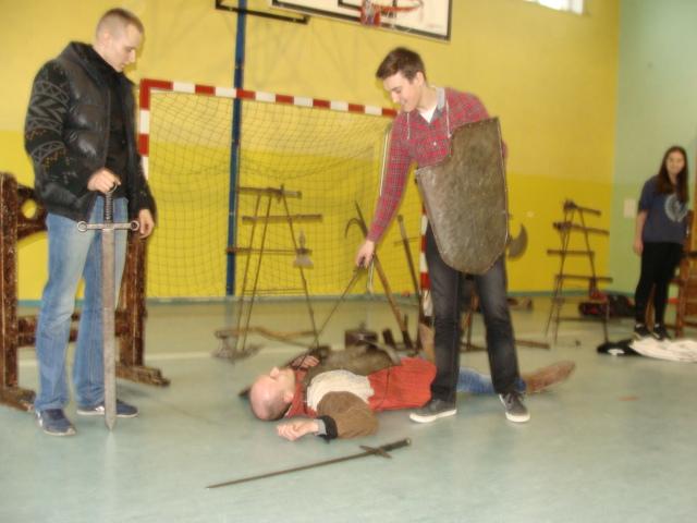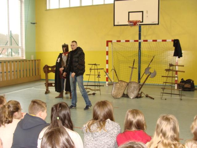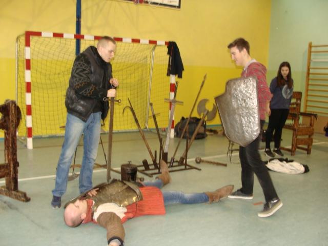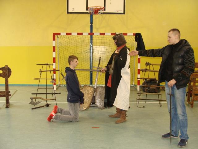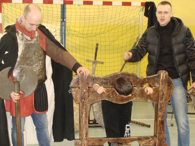 uczniowie mieli okazję poznać życie i kulturę średniowiecza m.in. rycerski ekwipunek i uzbrojenie, pojedynki, kodeks rycerski, prawo w średniowieczu - zakuwanie w dyby.