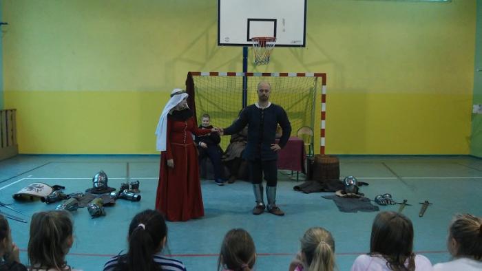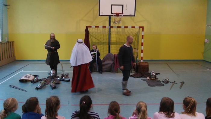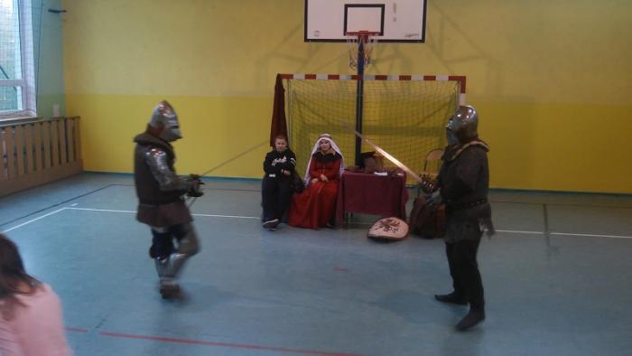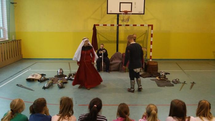 które w ramach rekonstrukcji historycznej zajmuje się odwzorowywaniem zwyczajów oraz realiów średniowiecza. Słupskie bractwo przybliżyło życie codzienne dawnych mieszkańców Pomorza Środkowego. Uczniowie mogli podziwiać kunszt rycerzy oraz nauczyć się dawnych tańców.