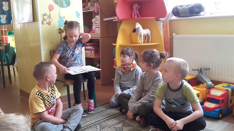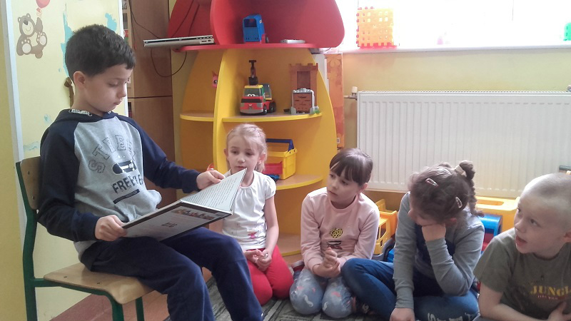Uczniowie klasy II SP czytają dzieciom z oddziału przedszkolnego.