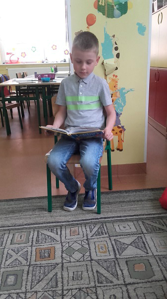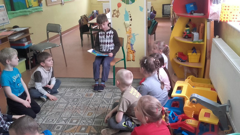 W ramach projektu "Miłośnik książek" uczniowie klasy II SP wyszli z inicjatywą czytania bajek swoim młodszym kolegom z oddziału przedszkolnego 6 - latków. Cykliczne spotkania z