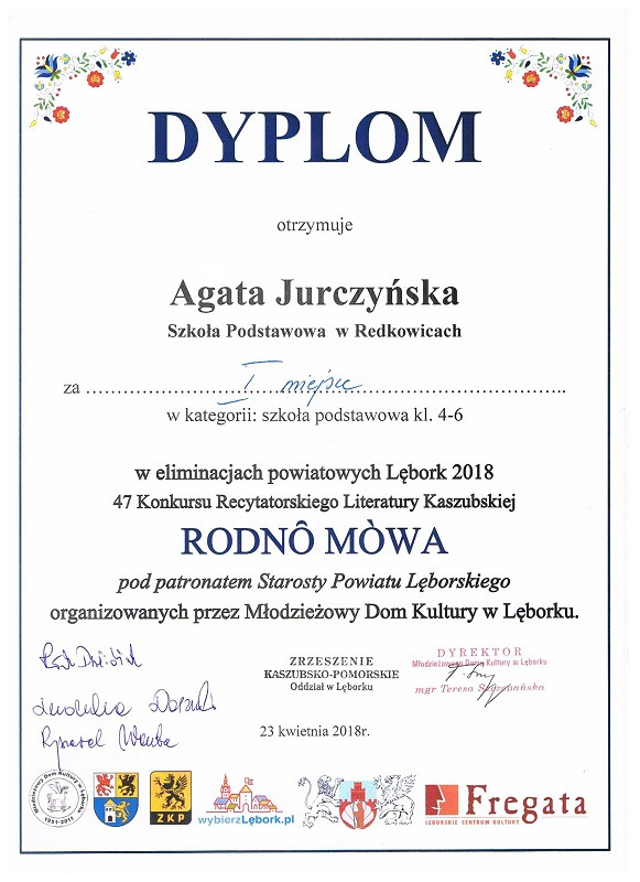 23 kwietnia 2018 r. odbyły się eliminacje powiatowe 47. Konkursu Recytatorskiego Literatury Kaszubskiej "Rodno Mowa" organizowane przez Młodzieżowym Domu Kultury w Lęborku. Naszą szkołę godnie reprezentowali Franciszek Zeitz oraz Agata Jurczyńska, która zajęła I miejsce .