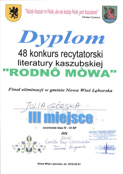 7 maja 2019r. uczniowie ci wzięli udział w konkursie na szczeblu gminnym , który odbył się w Gminnym Ośrodku Kultury w Nowej Wsi Lęborskiej. Wszyscy uczestnicy zaprezentowali płynnie piękną mowę kaszubską. Spośród 5 uczestników aż 4-ro zajęło czołowe miejsca.