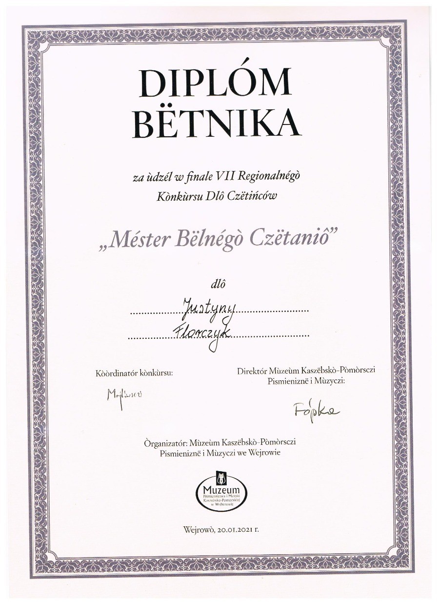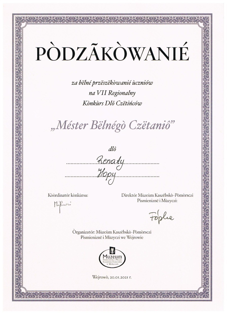 W miesiącu listopadzie 2020 r. po raz drugi przystąpiliśmy do konkursu pięknego czytania w języku kaszubskim. Konkurs z racji pandemii miał bezpośrednio etap finałowy. Dwie uczennice z naszej szkoły: Liliana Boetcher i Justyna Florczyk pieczołowicie przygotowywały się do czytania wybranych tekstów pod kierunkiem nauczyciela regionalisty. Nagrania prezentacji w formie on-line zostały przesłane do organizatora, czyli Muzeum Piśmiennictwa i Muzyki Kaszubsko-Pomorskiej w Wejherowie.