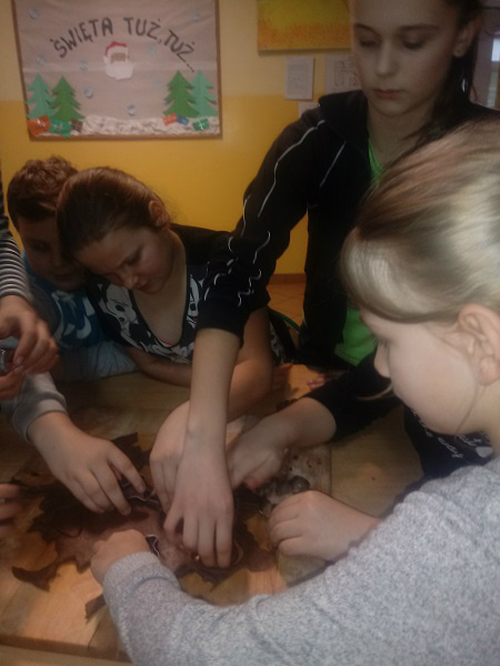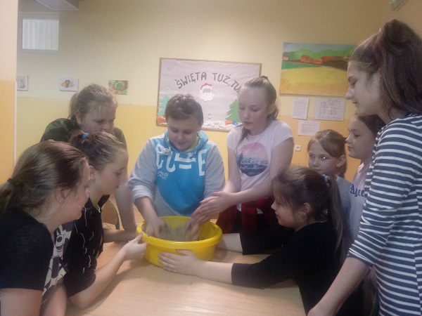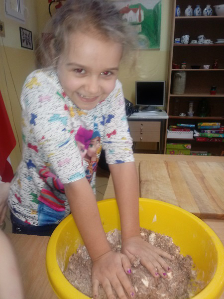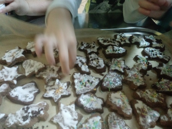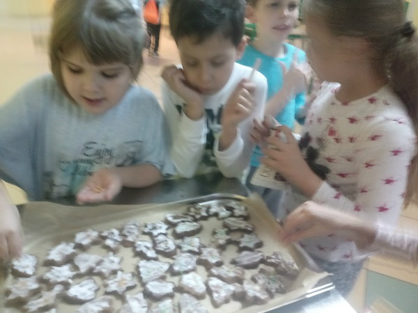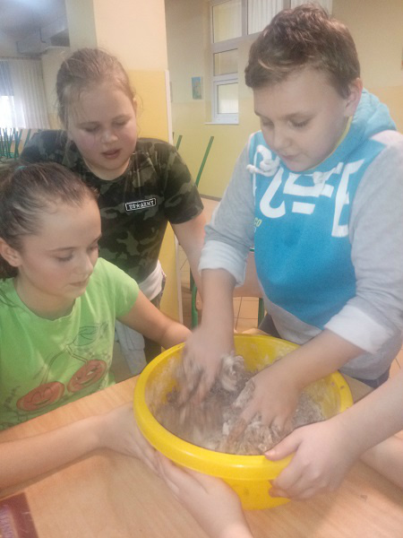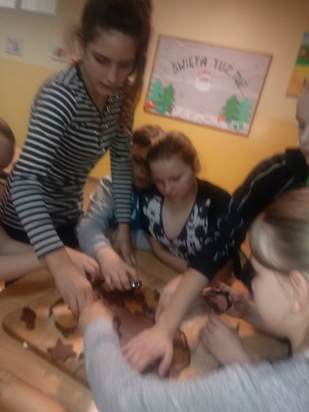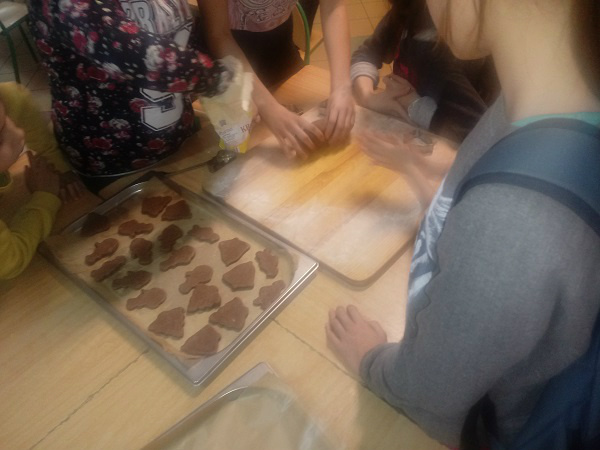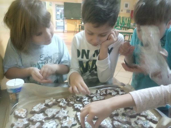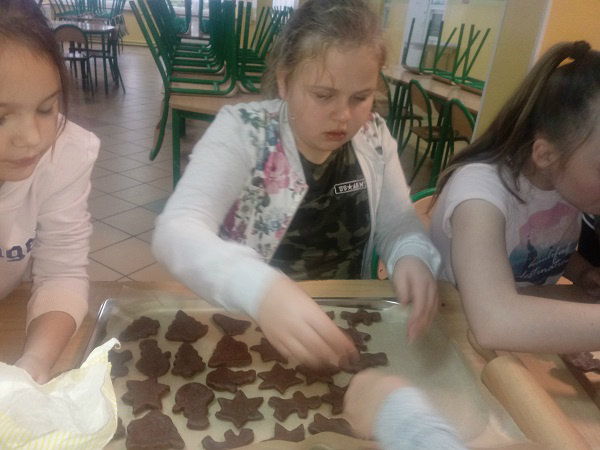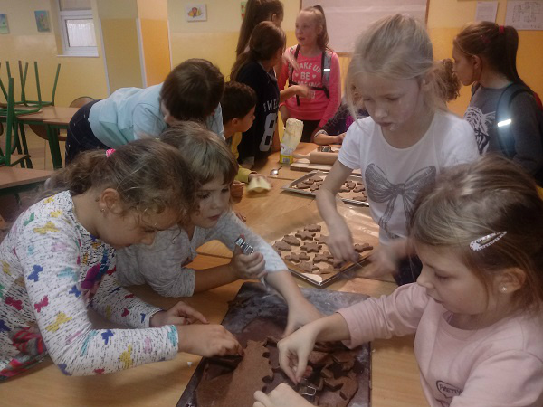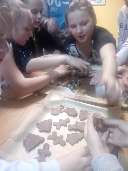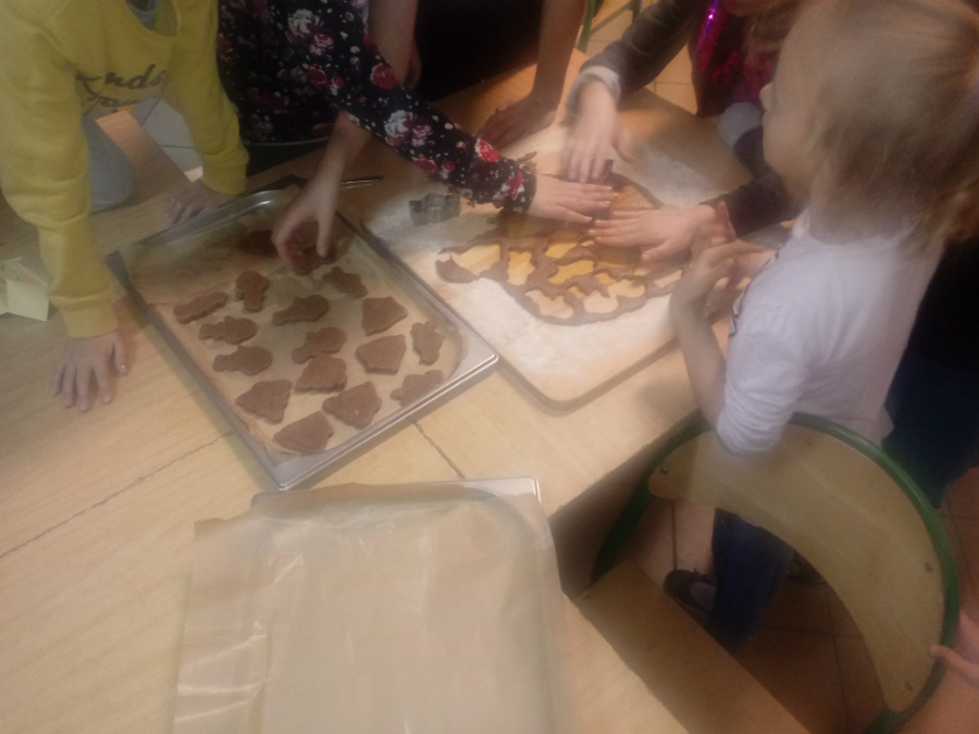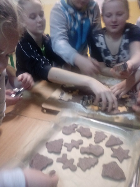 lekcjach języka regionalnego-kaszubskiego zabraliśmy się do pieczenia pierniczków. Wszyscy z ogromnym zaangażowaniem pracowaliśmy przy stole. Podczas pieczenia po szkole rozchodził się cudowny aromat powodujący, iż nie mogliśmy się doczekać, by posmakować naszych smakołyków. Pierniczki się udały , były piękne i bardzo smaczne.